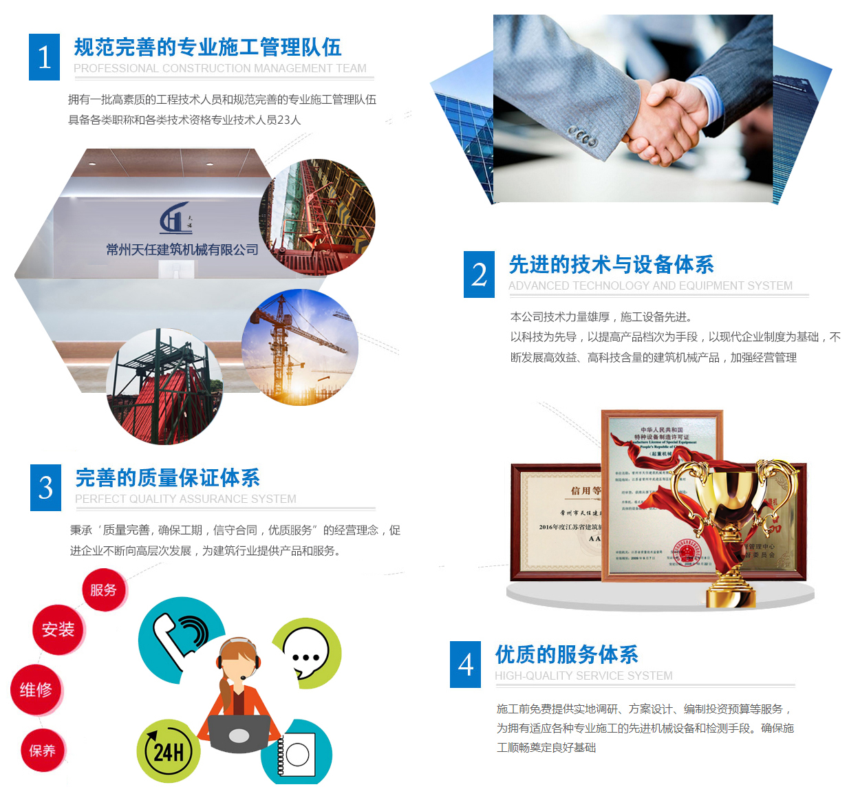 公司主要從事施工升降機、普通塔式起重機的制造、租賃、安裝、改造與維修等一條龍服務;擁有施工升降機(SCD200/200、SC200/200),QTZ63型普通塔式起重機,物料提升機(GJT10A)三大系列產(chǎn)品,并有中華人民共和國特種設備檢驗檢疫總局頒發(fā)的制造、改造與維修生產(chǎn)許可證。